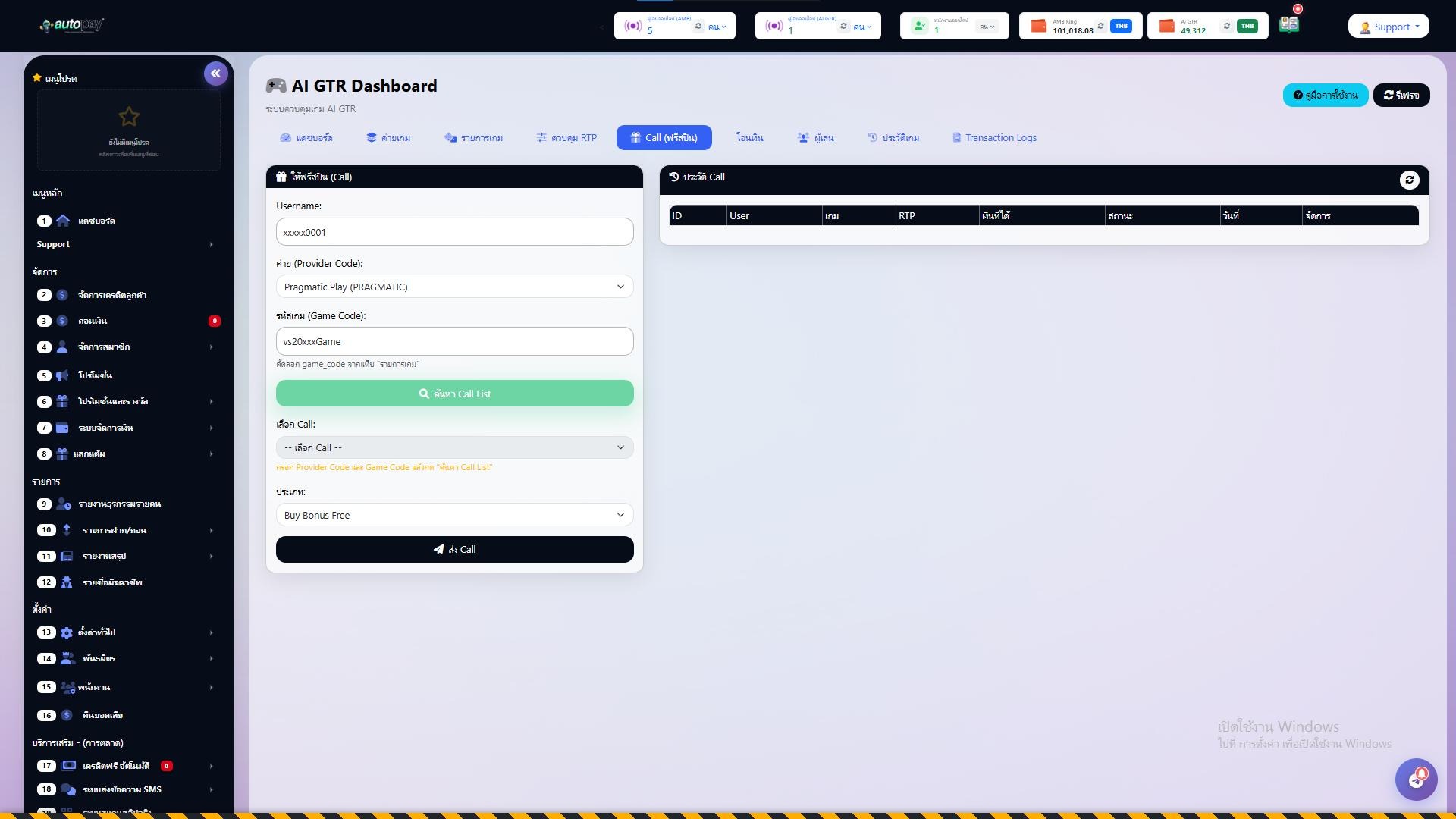| Call | การให้ฟรีสปิน/โบนัสแก่ผู้เล่น โดยระบบจะบังคับให้เกมออกรางวัลตาม RTP ที่กำหนด |