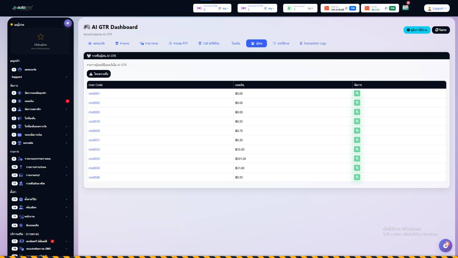 แสดงรายชื่อผู้เล่นที่มีเครดิตในระบบ AI GTR