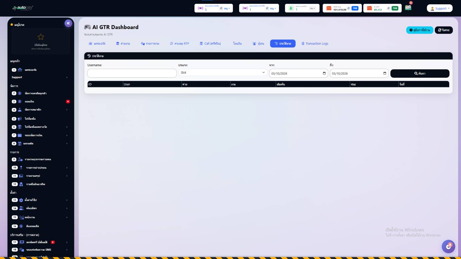 ข้อมูลที่แสดง: ค่ายเกม, รหัสเกม, เงินเดิมพัน, เงินที่ชนะ, วันเวลา